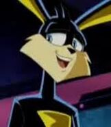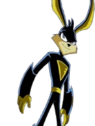 He wears a black bodysuit with yellow schemes, he has large rabbit ears, sonic blue eyes, and a spikey hair.