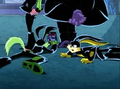 The DNA De-Scrambler was built to counteract the effects of Otto's Sonic DNA Scrambler, returning anything that was affected by the latter to normal form. Tech first used it on the transformed children, then himself and the other Loonatics, and finally Zadavia. It was destroyed during the battle with the Ringmaster Oddity after one of its tentacles crushed it.